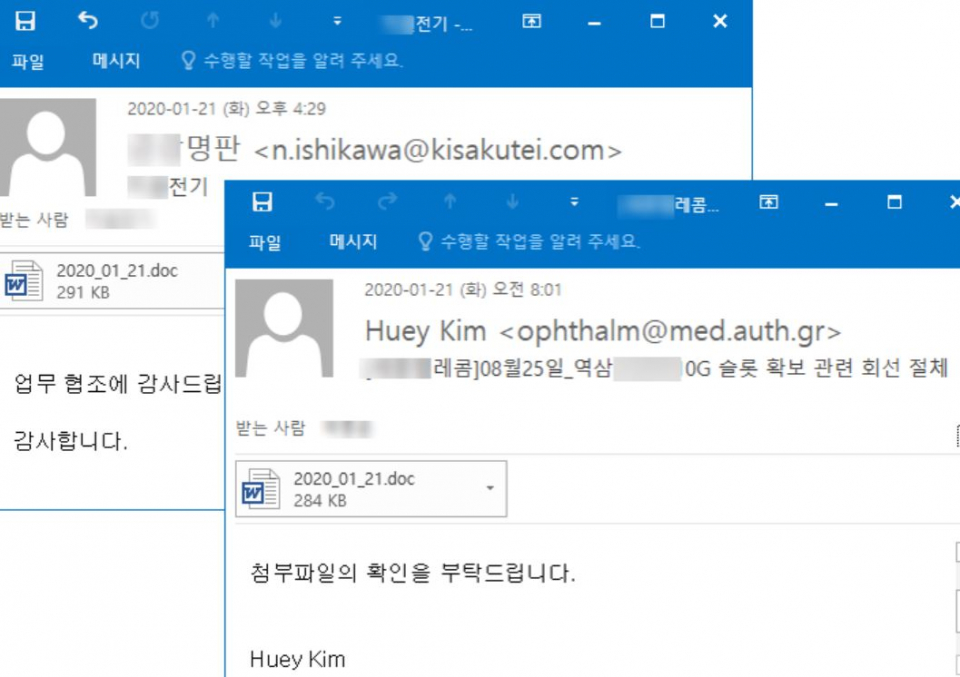 특정 국가 기관과 호텔, 통신사, 국내 기업의 정보를 무작위로 수집하거나 인용해 한국어로 작성된 메일과 함께 이모텟(이하 Emotet) 악성코드가 대량으로 유포되고 있어 주의가 필요하다.