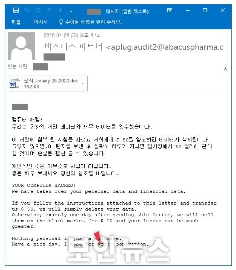 우리나라, 사용자 데이터 탈취 협박 메일로 이모텟 악성코드 유포중