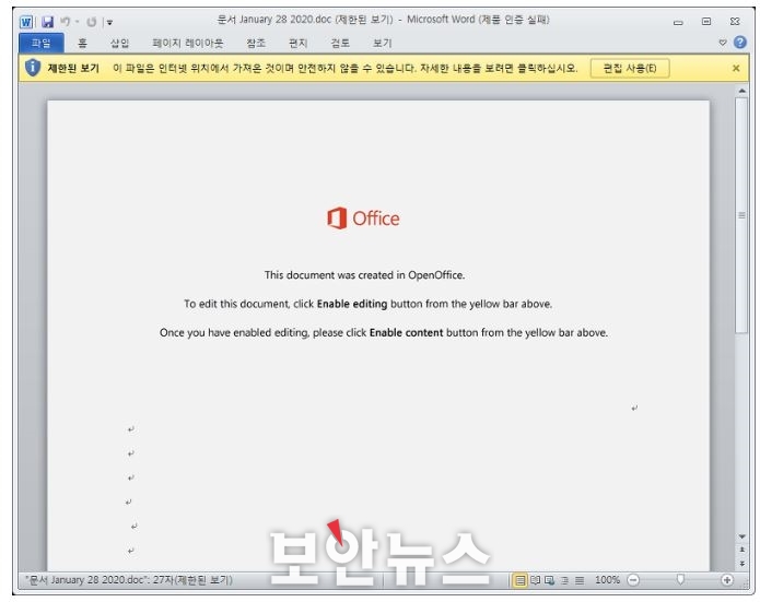 ▲매크로 실행을 유도하는 악성 DOC 파일[이미지=ESRC]