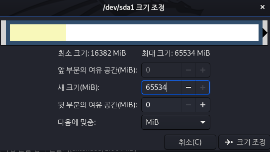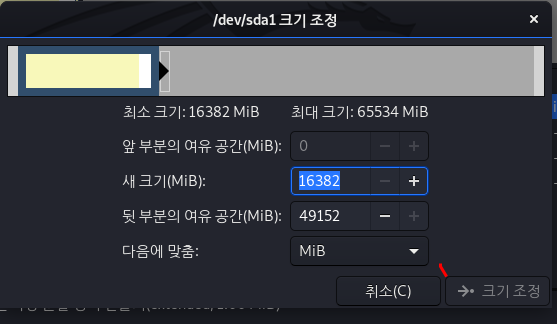 - 크기 조정에서 뒷부분의 여유 공간을 0으로 할당 후 새 크기에 [기존 새 크기 + 뒷 부분 공간]의 크기를 할당해주세요.
