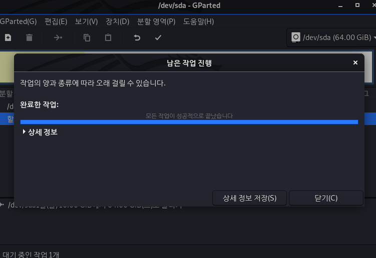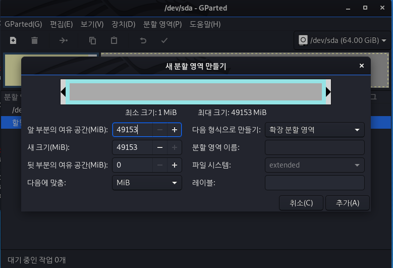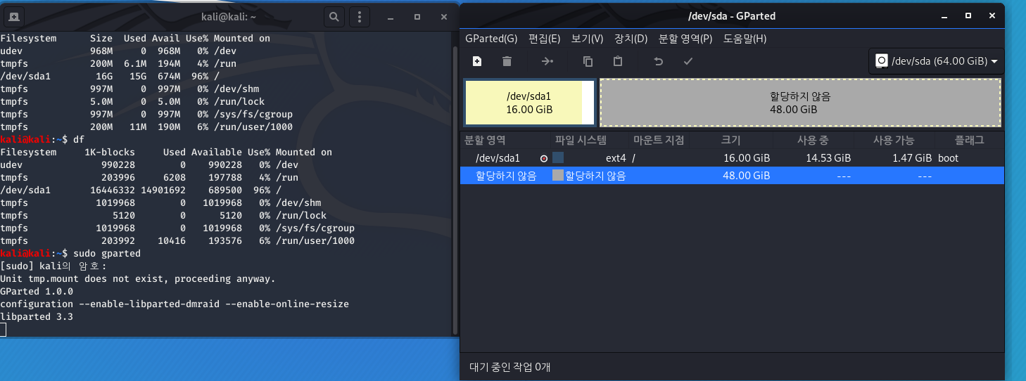 파티션 용량을 형성을 확인하기 위해 gparted 명렁을 사용합니다.
