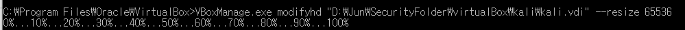 ex ) VBoxManage.exe modifyhd "D:\Jun\SecurityFolder\virtualBox\kali\kali.vdi" --resize 65536