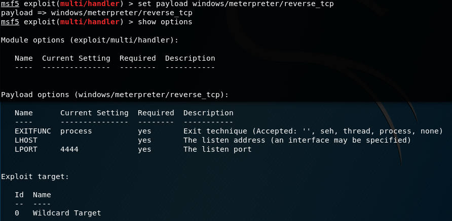 VictimPC에서 악성파일을 실행 시켜 Kali로 세션을 붙을 예정이므로 reverse_tcp payload를 설정한다.