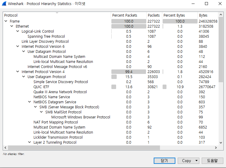 장치 별로 주고 받은 데이터에 대한 통계 정보로서 프로토콜 이름 옆에 있는 숫자는 개체의 수를 나타낸다.