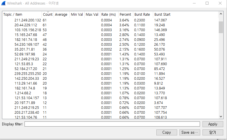 네트워크 패킷 출발지, 목적지 IP 주소 통계