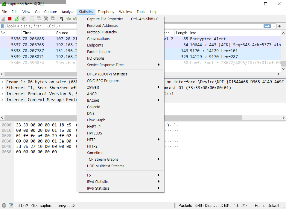 Wireshark 상단 메뉴에서 Statistics 메뉴를 선택하여 사용 가능하다.